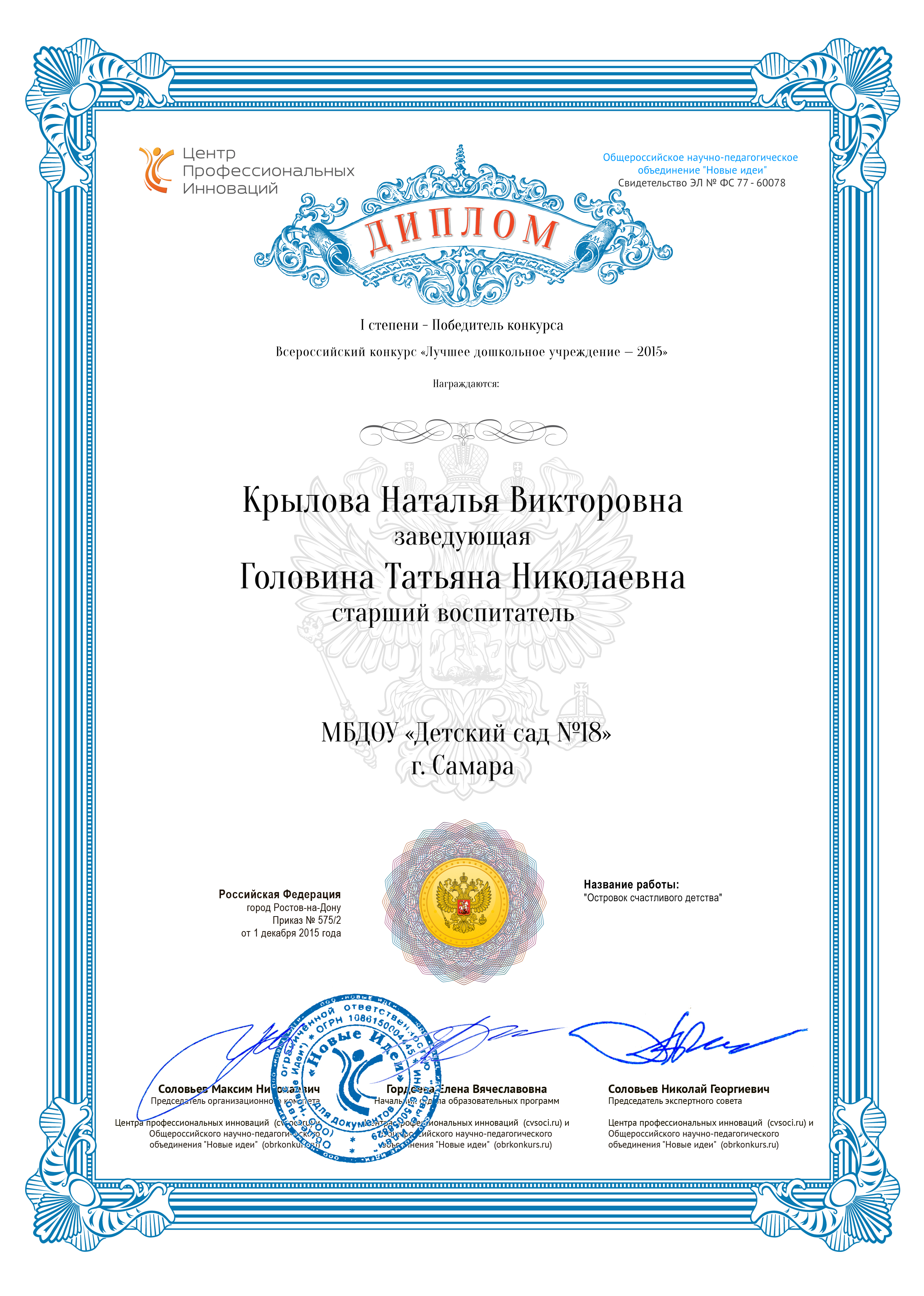 По итогам Всероссийского конкурса «Лучшее дошкольное учреждение – 2015» МБДОУ «Детский сад комбинированного вида №18» г.о.Самара признан победителем и награжден дипломом 1 степени.